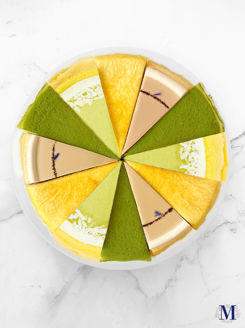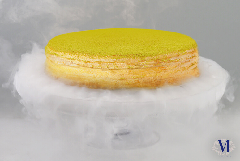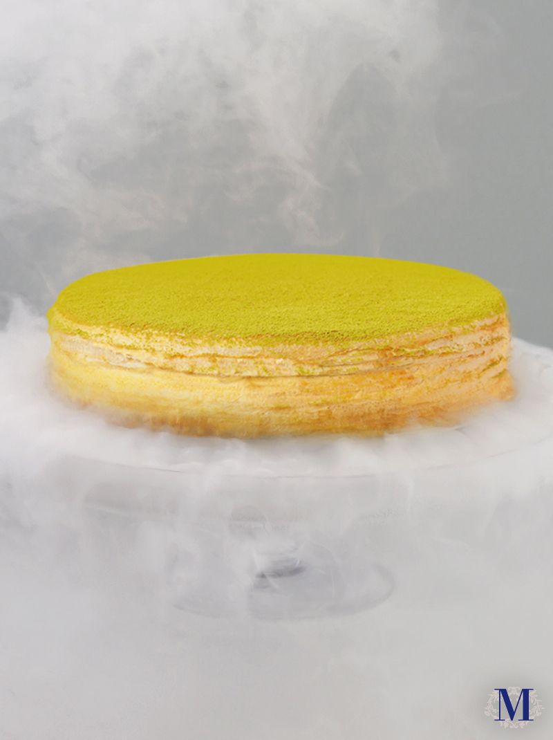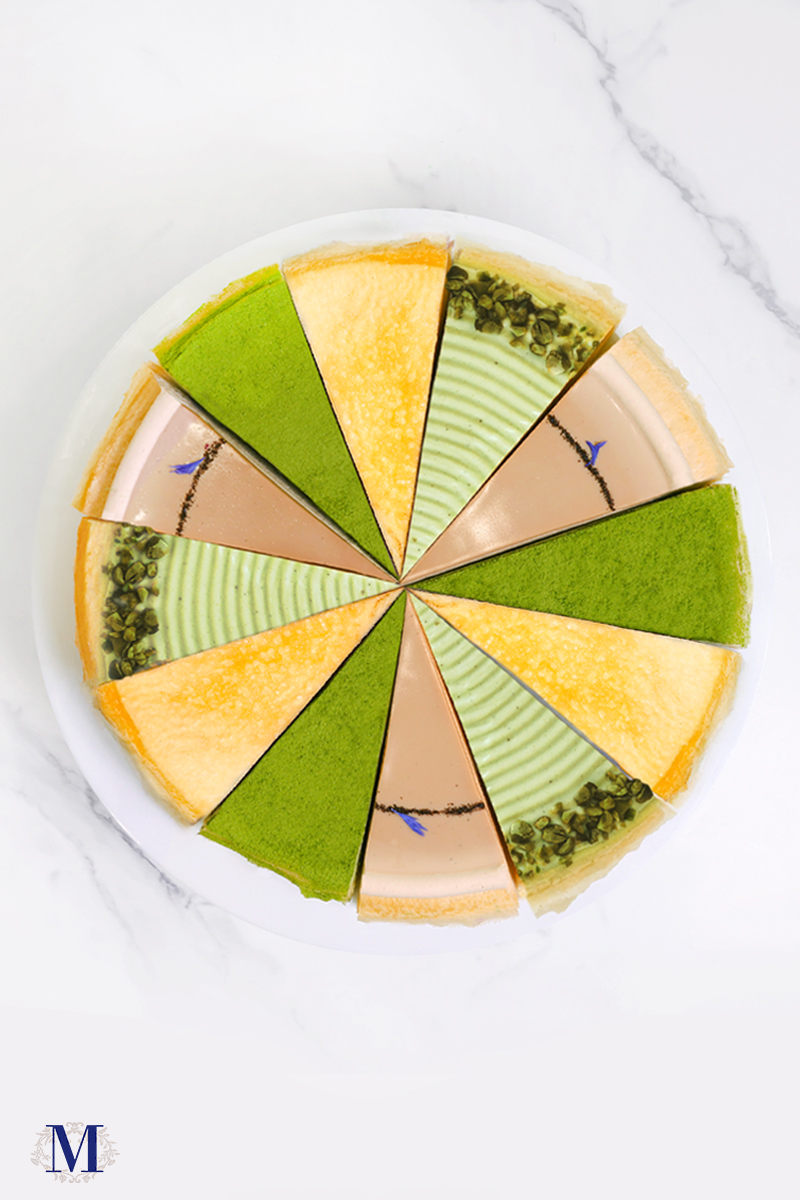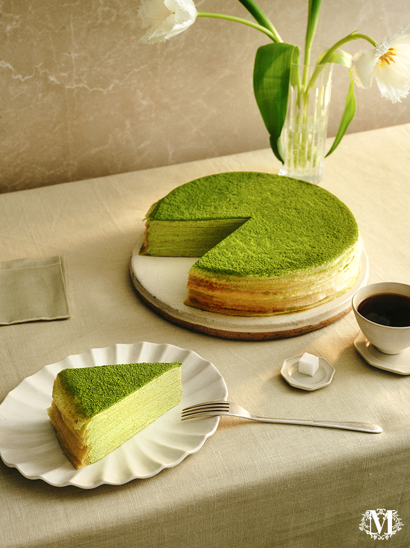 源自日本的高級抹茶粉滲透在細膩的淡忌廉中,鋪上多於20層的純手工超薄班戟,每一層都能夠嘗到抹茶的甘香。 蛋糕的表面亦會撒上同一種日本抹茶粉增加視覺味覺感受。