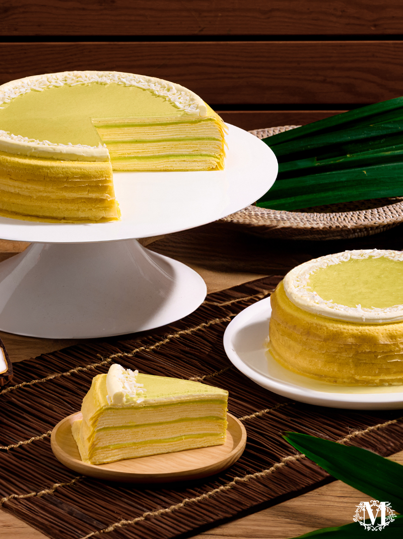 特別採用壓榨方式提取純天然班蘭葉汁精華,突出斑蘭葉最濃郁獨特的清香味道。 Lady M 利用一貫的獨門打發技巧製作出最質地細緻的咖央忌廉,並均勻塗抹在超過二十層的透薄班戟皮之間。自家製作的濃厚斑蘭咖央吉士醬分佈在蛋糕上中下層,增加蛋糕層次感,味道深邃馥郁。頂部一層晶瑩透亮的斑蘭啫喱,加上菲律賓椰子脆片,斑蘭與椰香交織,香濃不膩,是一款令人驚艷的千層蛋糕!