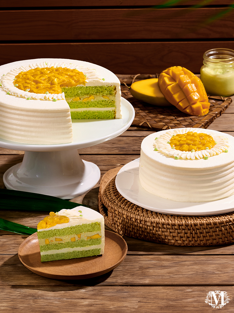 蛋糕夾層分別是由天然斑蘭葉汁製成的柔軟細緻斑蘭忌廉和新鮮芒果粒,及一層新鮮手工製作的滑嫩椰子布丁,搭配濕潤綿密的斑蘭海綿蛋糕,成為層次口感豐富的完美組合。塗抹於外層的鮮忌廉由椰子冧酒與馬斯卡彭芝士打發而成,比傳統忌廉口感更細膩絲滑;頂部舖上大量香甜芒果粒,以玫瑰花瓣形狀的忌廉襯托,使蛋糕更高貴典雅。