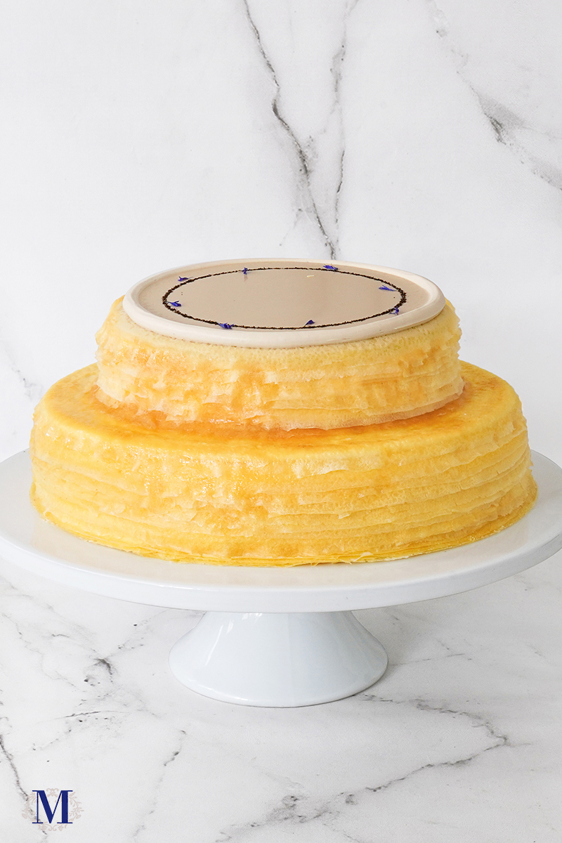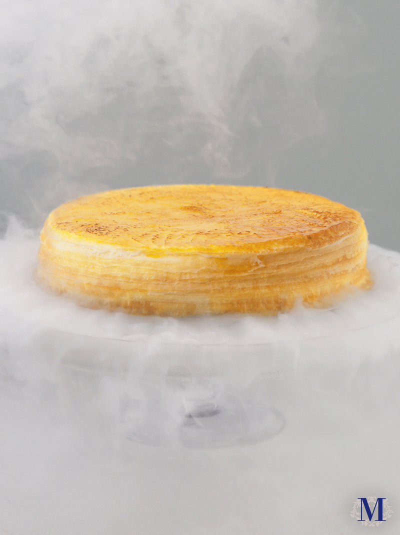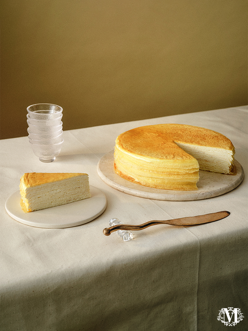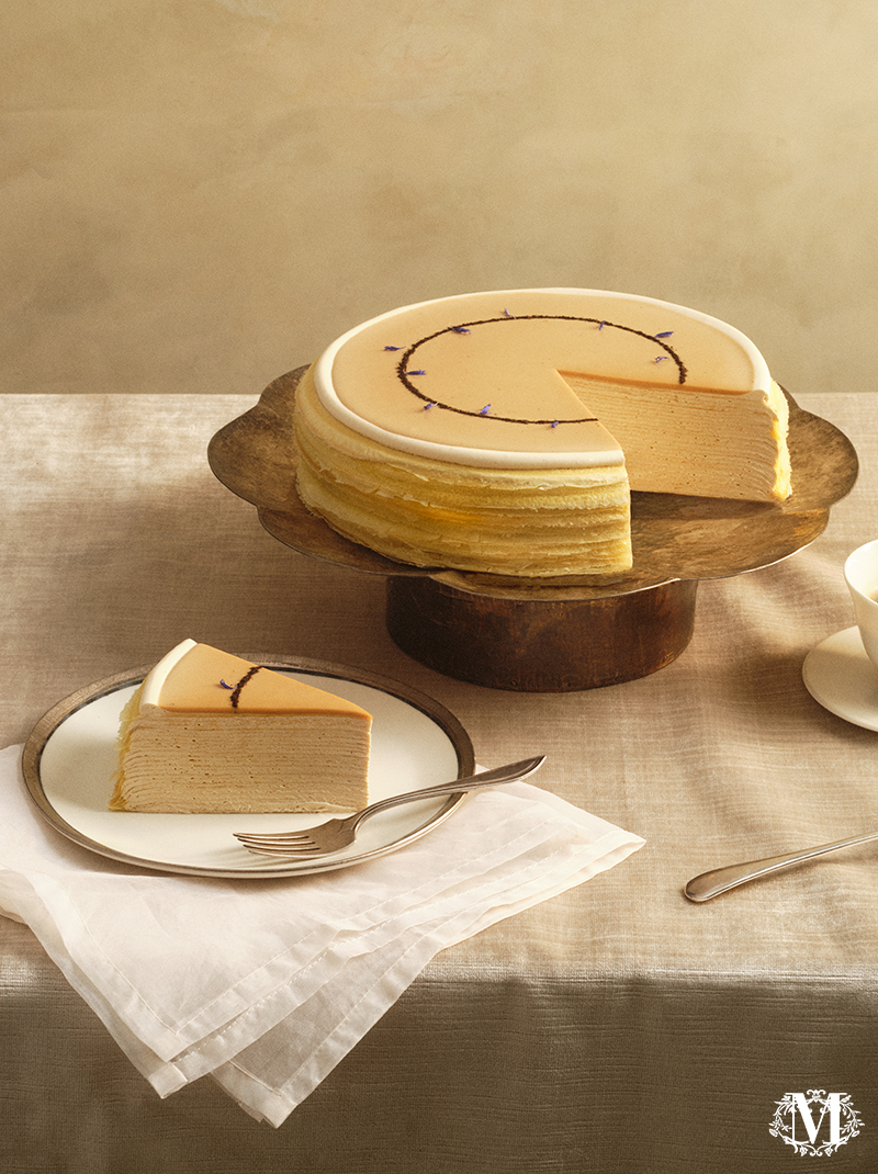 法國出產的伯爵茶,經精心泡製,做成茶香芳郁的伯爵茶忌廉。均勻地塗在每片透薄的班戟之間,超過二十層之多。蛋糕面層撒上自家磨研的伯爵茶葉碎粒,並飾以矢車菊花的花瓣,幽香怡人。可供20人享用的兩層蛋糕滋味倍增,為每個慶祝場合及聚會締造完美。