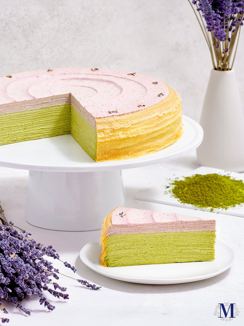 上半部分使用法國出產的薰衣草提煉,做成花香芳郁的薰衣草忌廉,均勻地塗在每片透薄的班戟之間,下半部分為苦中帶微甜的抹茶千層,堆疊之間超過二十層之多。切開蛋糕將展示迷人的粉紫色和抹茶綠色雙色設計,面層飾以自家細挑磨研的薰衣草碎粒,清香迷人。