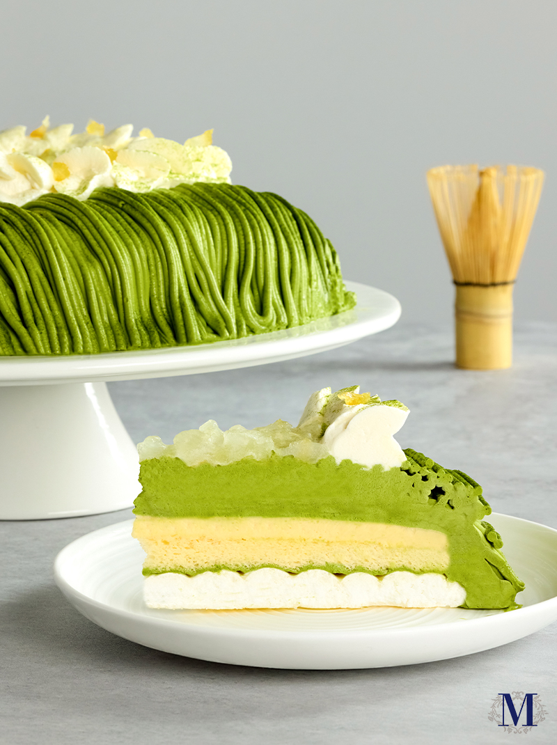 打破傳統水果蛋白餅的概念,抹茶柚子蛋白餅以靈感來自栗子蛋糕的非傳統外觀呈現,點綴京都抹茶忌廉蓉和由愛媛新鮮柚子醬製成的柚子啫喱。頂部點綴糖漬柚子皮,帶來清新風味。蛋糕由四層組成:抹茶忌廉蓉、柚子醬、海綿蛋糕,以及酥脆的蛋白餅底,呈現出一款優雅而創新的甜品體驗。
