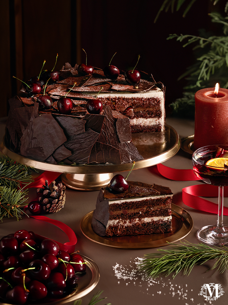 沿用傳統法國朱古力海綿蛋糕為軸心,每層蛋糕體表面均勻鋪上自家製車厘子果醬,味道濃郁且醇厚。綿密蓬鬆的蛋糕體之間分別注入兩款醉人夾心 ── 軟心黑朱古力忌廉及酒浸車厘子混合德國車厘子白蘭地忌廉軟心芝士,不僅增添濕潤度,更讓整體口感更加鬆軟細膩。蛋糕表面綴以手工朱古力片,每一塊皆由人手用心製作,宛如獨一無二藝術品。最後再舖上當季新鮮原粒空運直送車厘子,色澤亮麗又甜美多汁,為這個充滿節日氣氛的聖誕揭開序幕。