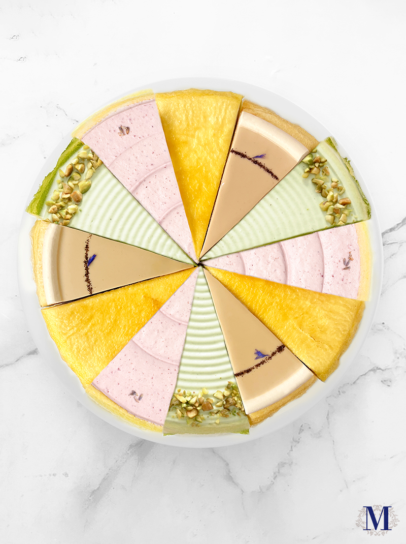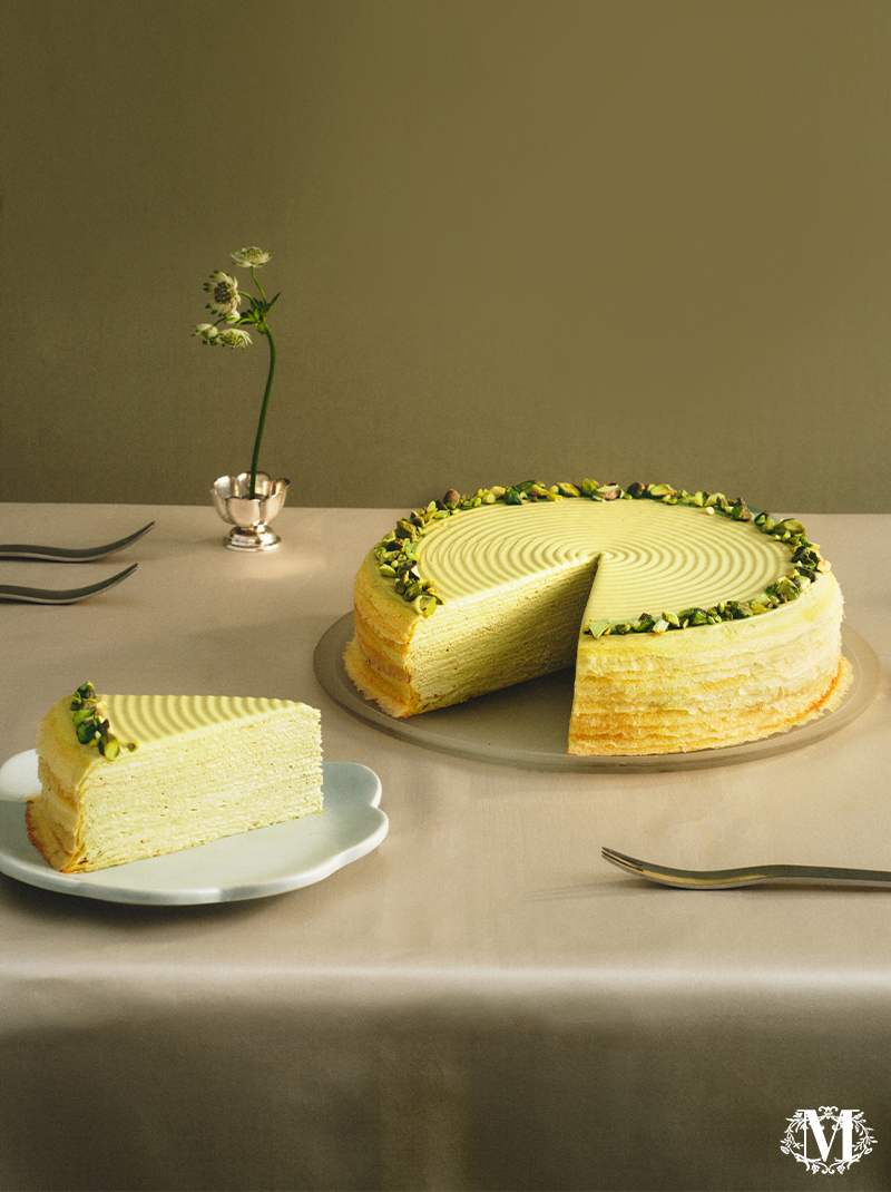 以原產自法國的頂級開心果製成幼滑忌廉,均勻地塗在不少於20層的透薄班戟之間,為經典千層蛋糕注入獨特堅果香味,再於面層撒上香脆開心果碎點綴,淡淡果仁幽香更顯高貴典雅。