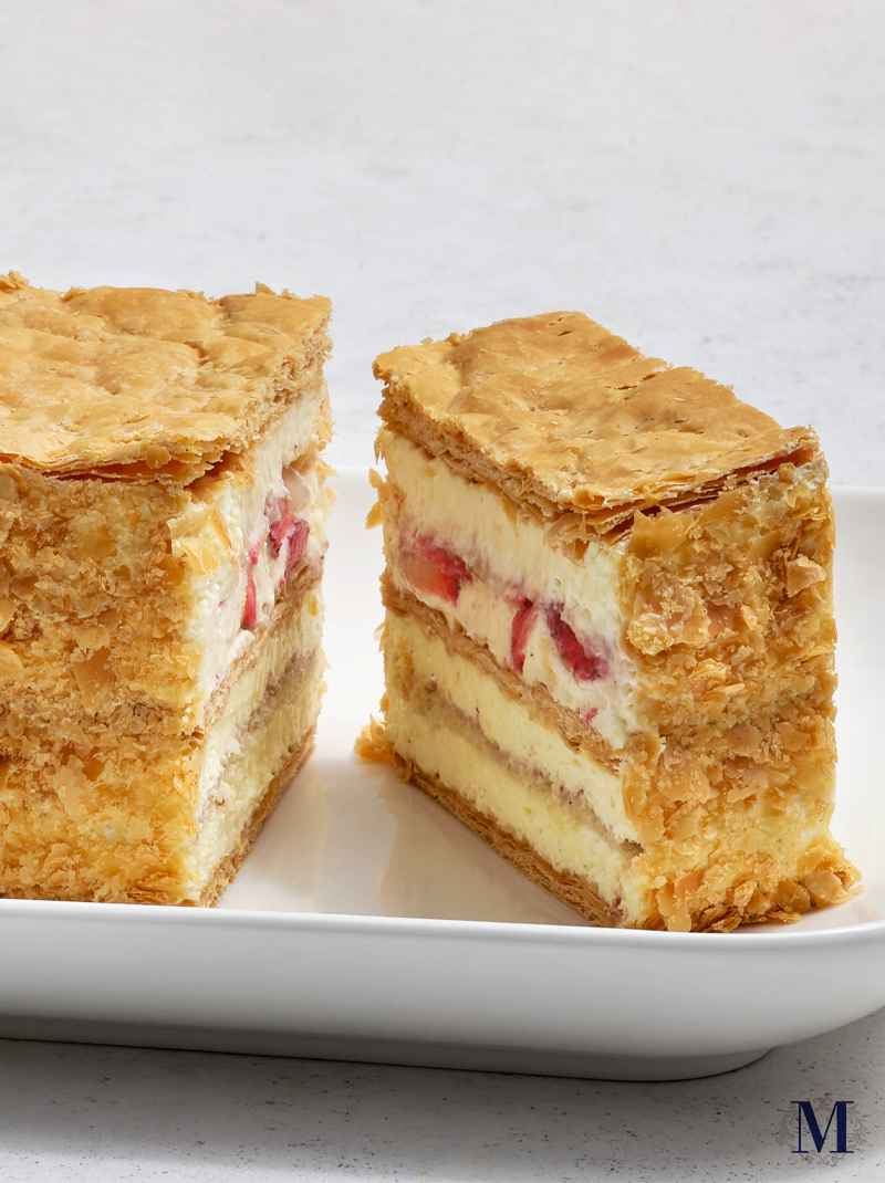 千層酥層次分明,散發着濃郁的法國牛油香氣。慢慢切下去,你會看到完美交疊的鬆脆酥皮,交疊着滲透櫻桃酒香氣的新鮮淡忌廉、極具誘惑力的海綿蛋糕和士多啤梨果醬,與忌廉融為一體的新鮮的士多啤梨更瀰漫着天然果香。