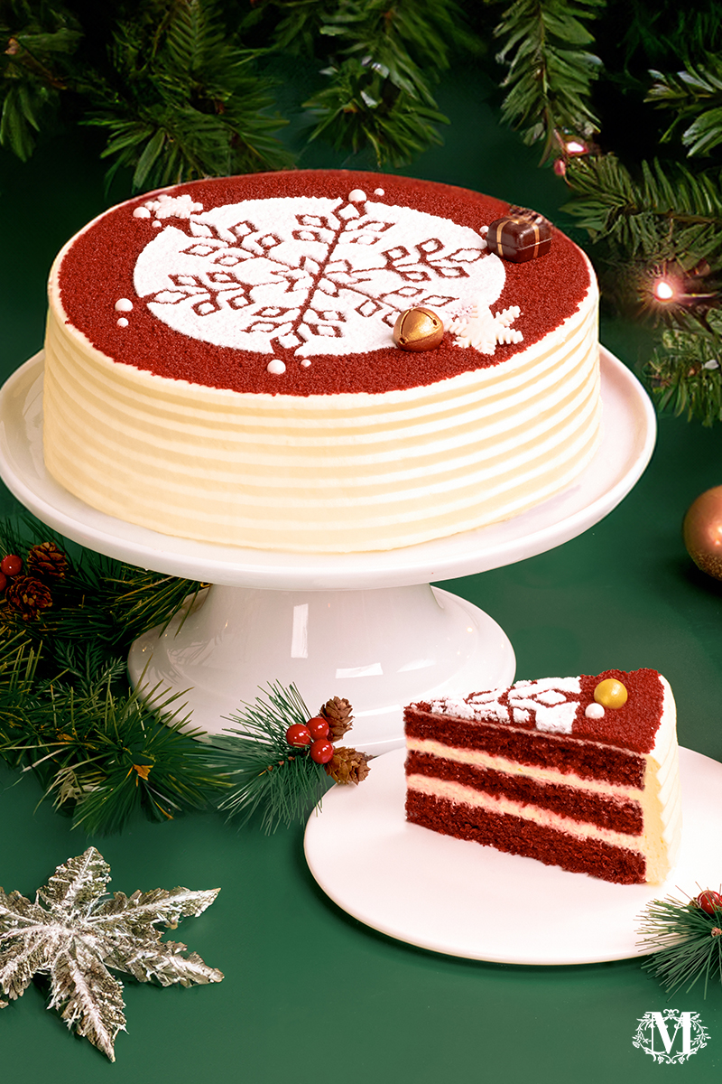 三層濕潤綿密的海綿蛋糕,融入新鮮打成的忌廉芝士,點綴著迷人閃爍的雪花、叮鈴作響的聖誕鈴鐺,讓你每一口都能沉浸在充滿喜悅和浪漫的假日氛圍當中。